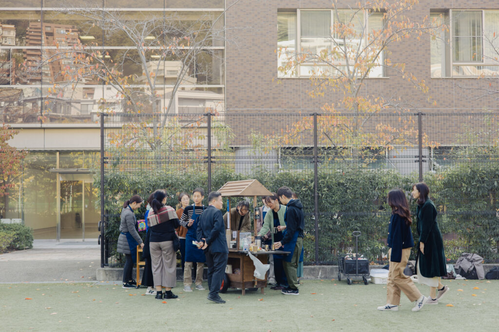 研究会に招聘した講師は、医療福祉や地域創造の専門家から、キュレーターや芸術家まで多岐にわたった。それらの研究会を通じて、公共の場所に屋台でカフェを出すことの効果、若者にとって魅力のある居場所となるための要点、カジュアルな場所で相談を行う時に注意すべき点、アートで人と人をつなぐための手法、大学という場に社会的処方を導入することの意義、アートを通じて地域社会とつながる方法など、多くの知見を得ることができたと考えています。このような文献調査、視察、研究会を通じて知見を深めつつ、それらと並行して月に1回のペースで屋台カフェの実践活動を行いました。実践活動を通じて生じた疑問が次の研究会のテーマにつながるなど、実践と研究を有機的に循環させながら、活動の質を高めていくことができました。特に、名古屋大学の学生支援本部と、この活動を通じて継続的な関係を構築することができたことは大きな成果です。それぞれの活動を相互に視察し、それは甲南大学での対面での研究会の開催につながっただけでなく、2025年5月10日に名古屋大学で開催された日本学生相談学会第43回大会のワークショッププログラムのひとつとしてご招待いただき、研究代表者として服部がワークショップの講師を務め、名古屋大学学生支援本部前で「雑談・屋台カフェ」の実演も行うことができました。